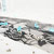 Die Menükarte ist mit einer stilvollen, grauen Spitze umwickelt. Drei Bänder und eine Blume befestigen den Kreis ("Menü - Gemeinsam gutes Essen geniessen)